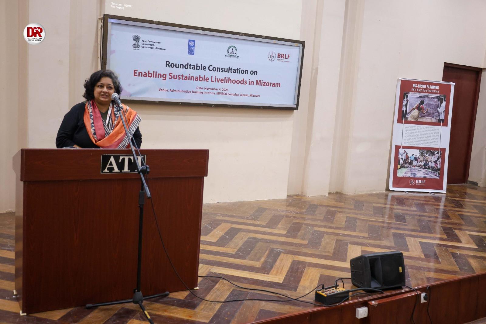 Roundtable Consultation on Enabling Sustainable Livelihoods in Mizoram” was held at the ATI Auditorium, MINECO, jointly organised by the Bharat Rural Livelihoods Foundation (BRLF), Rural Development Department, Government of Mizoram, United Nations Development Programme (UNDP), and Mizoram University. The discussion focused on strategies to promote sustainable livelihood development and the advancement of rural communities. Prof. Lalnilawma, Minister of Rural Development, graced the occasion as the chief guest. Also in attendance were Dr. K.C. Lalmalsawmzauva, Advisor to the Chief Minister (Handholding); from BRLF, Mr. Himangshu Das, Programme Officer, and Dr. Aruna Pandey, Head – Research & MEL; along with other officials and experts.