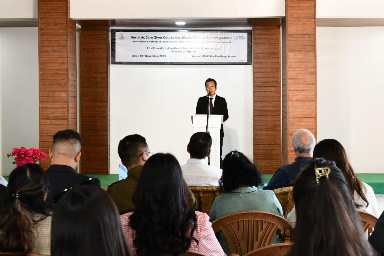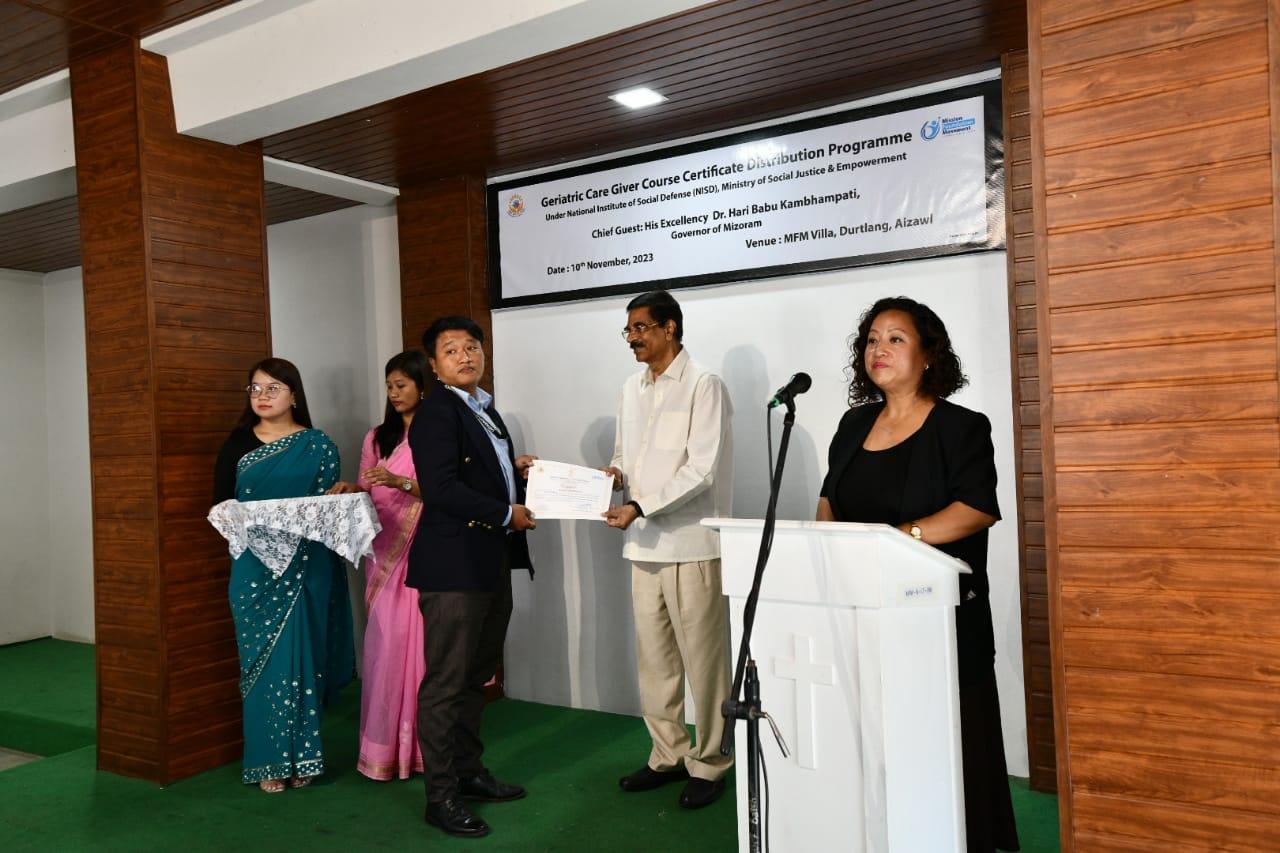 In his address, the Governor lauded the important initiatives currently being undertaken by the MFM, Durtlang for enhancing the youth of Mizoram with useful skills required in the sectors that offer jobs. He congratulated the first batch of 25 young people, who upon completing 3 three-month courses of Geriatric Care giving received their professional certificates today. He also spoke about the sure chances of getting a good salaried job in the healthcare services sector that include geriatric caregiving within the country and abroad as many developed countries have a huge old age population. On this occasion, he reiterated the importance of taking up professional courses as it promises a higher chance of getting employed outside the governmental sector that cannot accommodate the ever-growing number of graduates every year. On this note, he once again advised the youth of Mizoram to be motivated and aim for jobs outside the state.