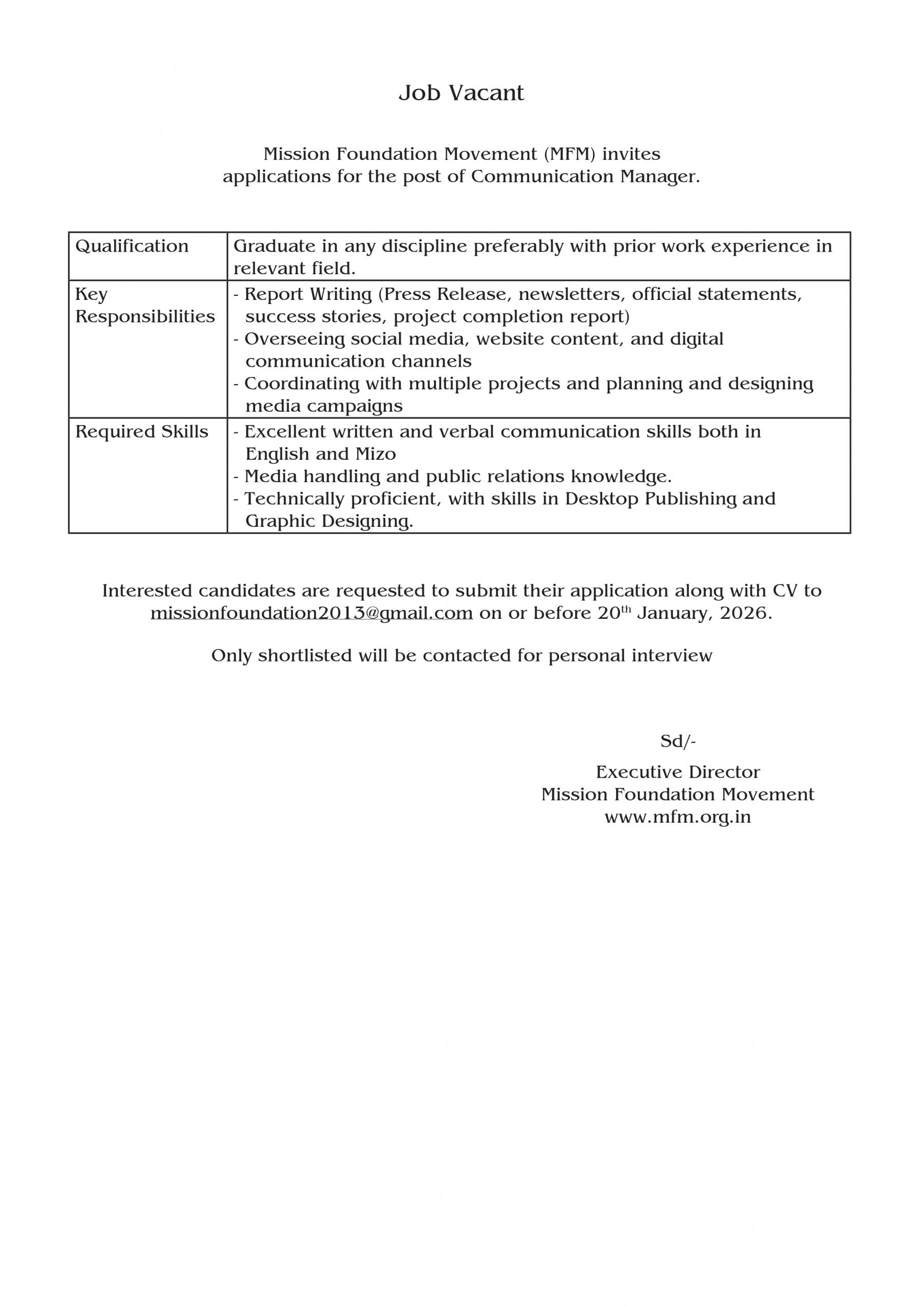 Communication Manager Job Vacant