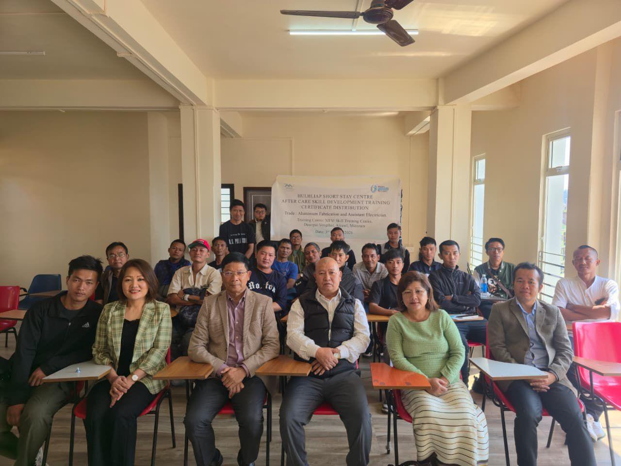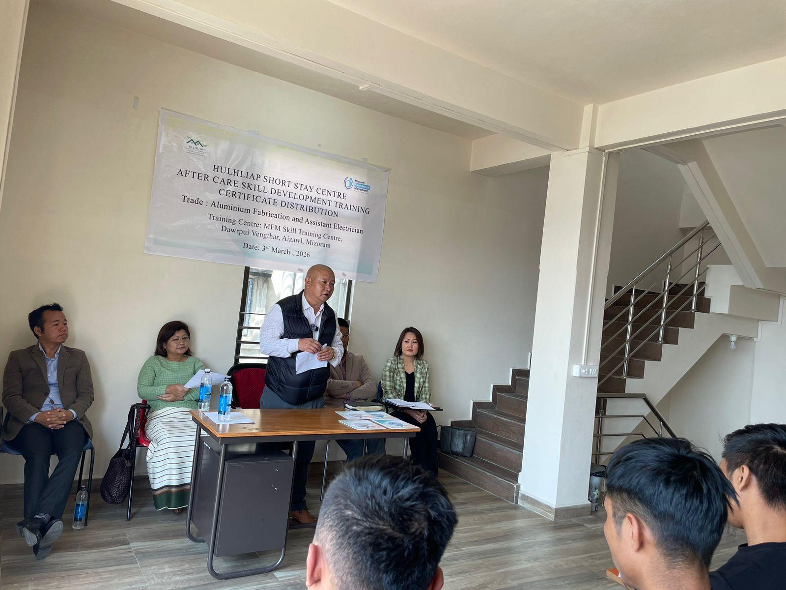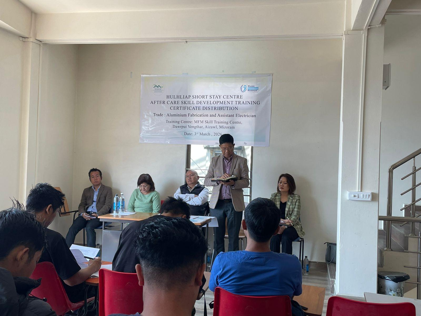 On 3rd March, the closing function and certificate distribution ceremony for the Skill Training Programme conducted for residents of the Hulhliap Short Stay Centre (SSC) was held at the MFM Skill Training Centre, Dawrpui Vengthar. The training programmes included Aluminium Fabrication and Assistant Electrician courses. In this batch, 14 participants completed the Assistant Electrician course, while 21 participants completed the Aluminium Fabrication training.