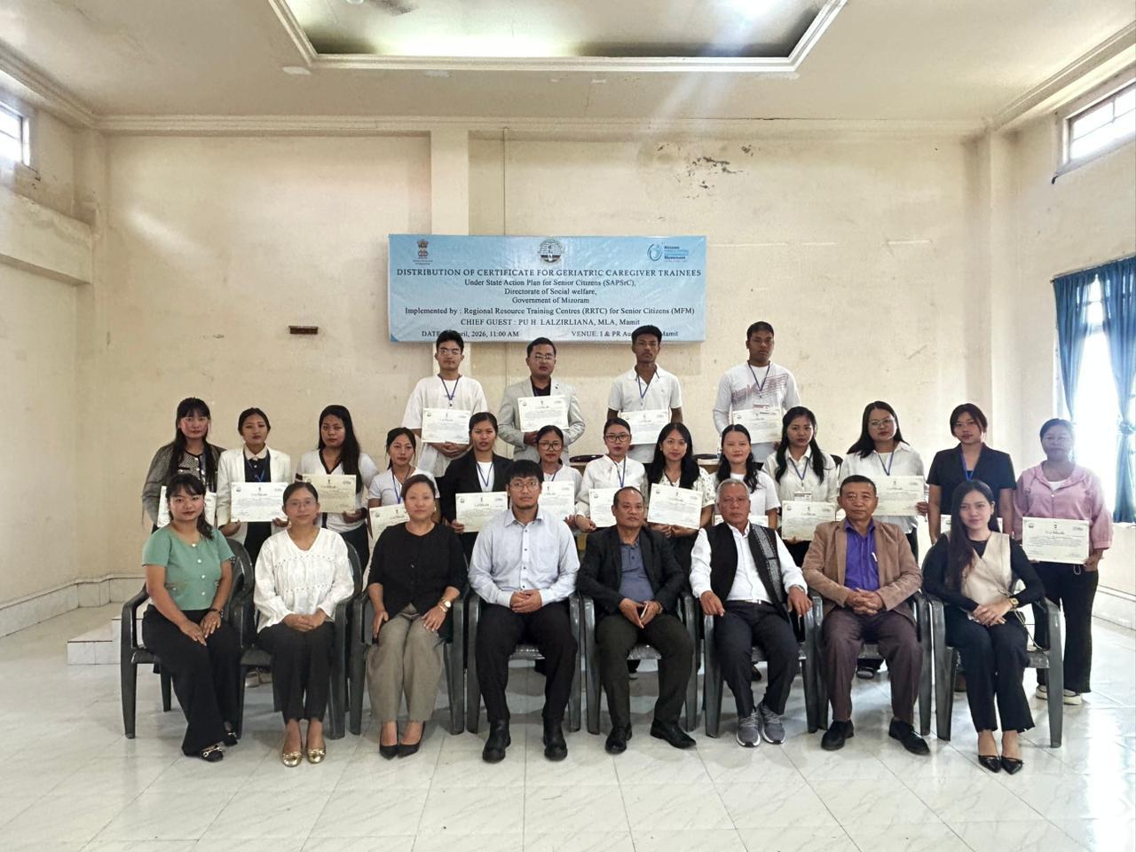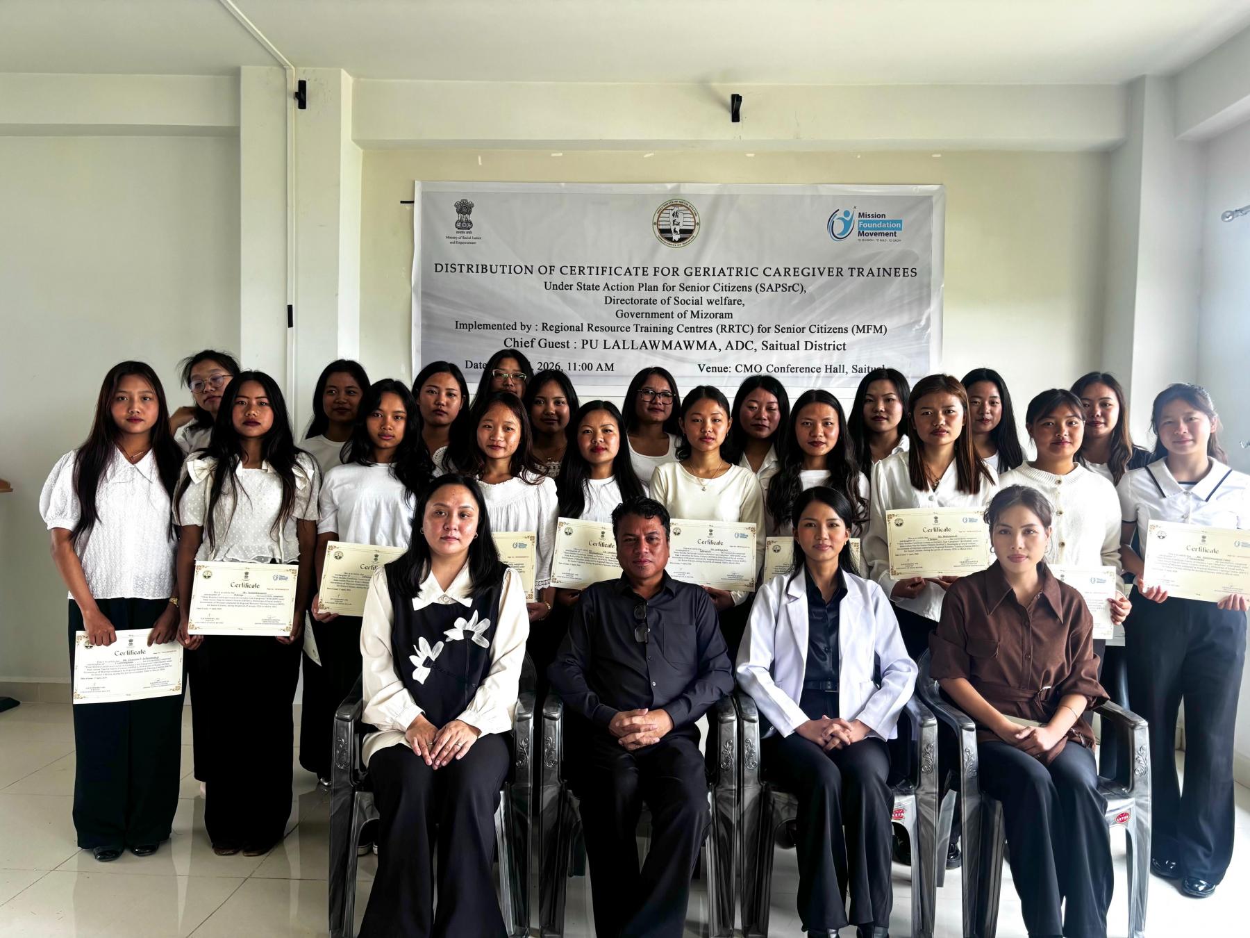 On April 1, 2026, the Social Welfare Department, in collaboration with the Mission Foundation Movement, organized a certificate distribution programme for 120 trainees who completed the Geriatric Caregiver course. The programme was held across four districts—Champhai, Lunglei, Mamit, and Saitual. In each district, officials from the Social Welfare Department led the programme, followed by a brief report presentation from the Mission Foundation Movement. It was highlighted that the Geriatric Caregiver training in these four districts was conducted in two shifts, making it flexible and accessible. This arrangement allowed even college students to participate conveniently, without facing major difficulties, and successfully complete their theory, practical classes, and examinations, which was highly appreciated. Distinguished guests attended the programme in each district: